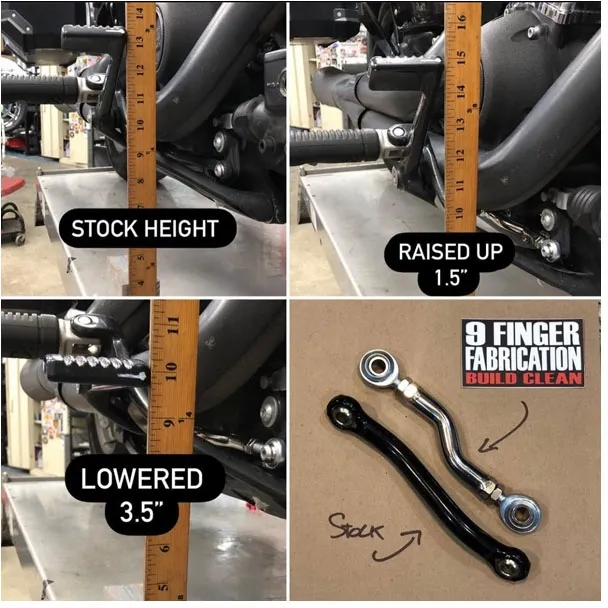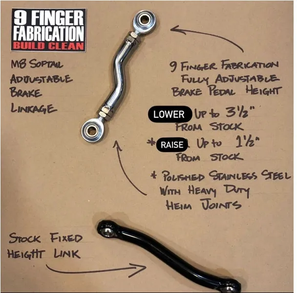 Fully adjustable for brake pedal height. Direct replacement for the stock non-adjustable brake linkage. Allows adjustments of the brake pedal from 3-1/2" lower to 1-1/2" higher to compensate for seating height, rider length and preference. Provides quicker and more comfortable brake actions. Stainless steel, complete with heavy duty heim joints.