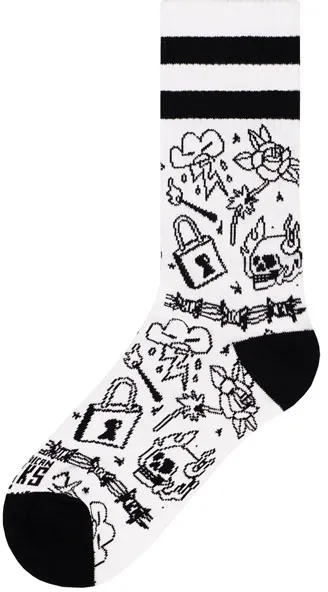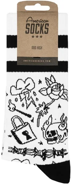 ×The Mid High Socks by American Socks are a staple. Made from soft cotton, the crew socks have a mid-calf fit. All of them are fun socks with bold patterns and graphic designs that scream attitude. Inspired by streetwear, tattoo art, skateboarding, alternative music and Japanese style, every pair is a canvas. Created in collaboration with artists, these are the perfect gift socks or present. Durable, breathable, unisex and always comfortable, these crazy crew socks with stripes are built for all terrain, from skate sessions and concerts to chilling with friends. Fun, Original, Funky and alternative, they're socks that say something about you. Find your pair, and join the crew! Mid High Length, half-way of your lower leg Vegan friendly Comfy cotton blend One size fits most - 36 to 46 EU Composition: 68% cotton, 16% polyamide, 8% polyester, 7% elastodiene, 1% elastane