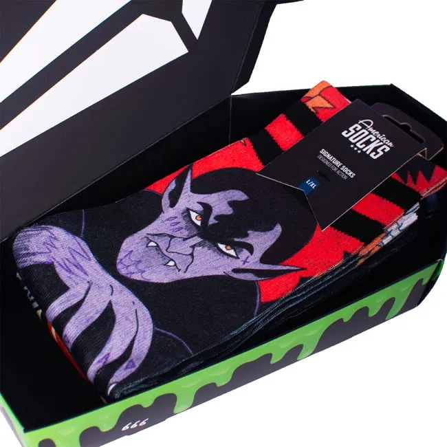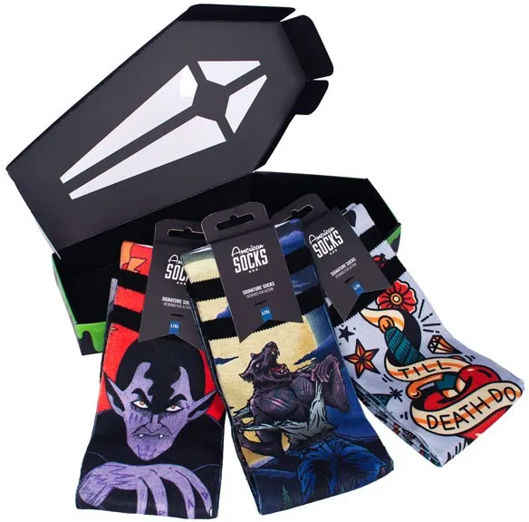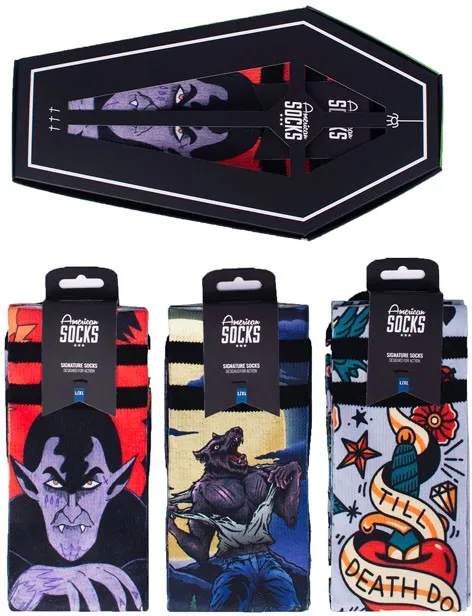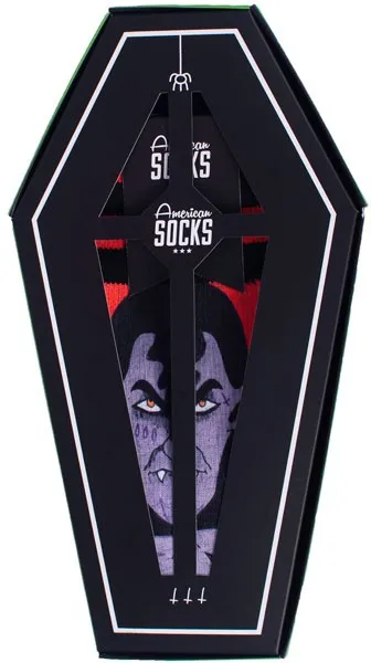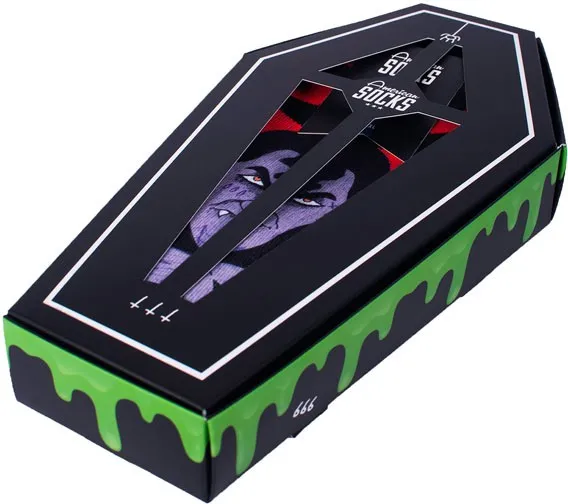The Sock Gift Boxes from American Socks are more than just socks in a box. Each set comes with 3 pairs of our best crew socks designs, created in collaboration with artists. From a skateboard-shaped box to a coffin with Dracula or a guitar amp, every gift set is as unique as what's inside. Perfect as a birthday present or just because you can, the sock gift boxes are unisex and made to thrill skaters, surfers, gamers, music fans and anyone into tattoo designs. Find your perfect gift box and surprise someone you care about with socks that truly speak their language. Mid High Length - Half-way of your lower leg Two Sizes for a Perfect Fit or one size fits most Designed for Action and Comfort Moisture-Wicking Technology to keep your feet cool and dry 67% Coolmaxr, 17% Polyamide, 10% Cotton, 5% Elastane Machine Wash at 30C/86F. Do not Tumble Dry, Bleach or Iron