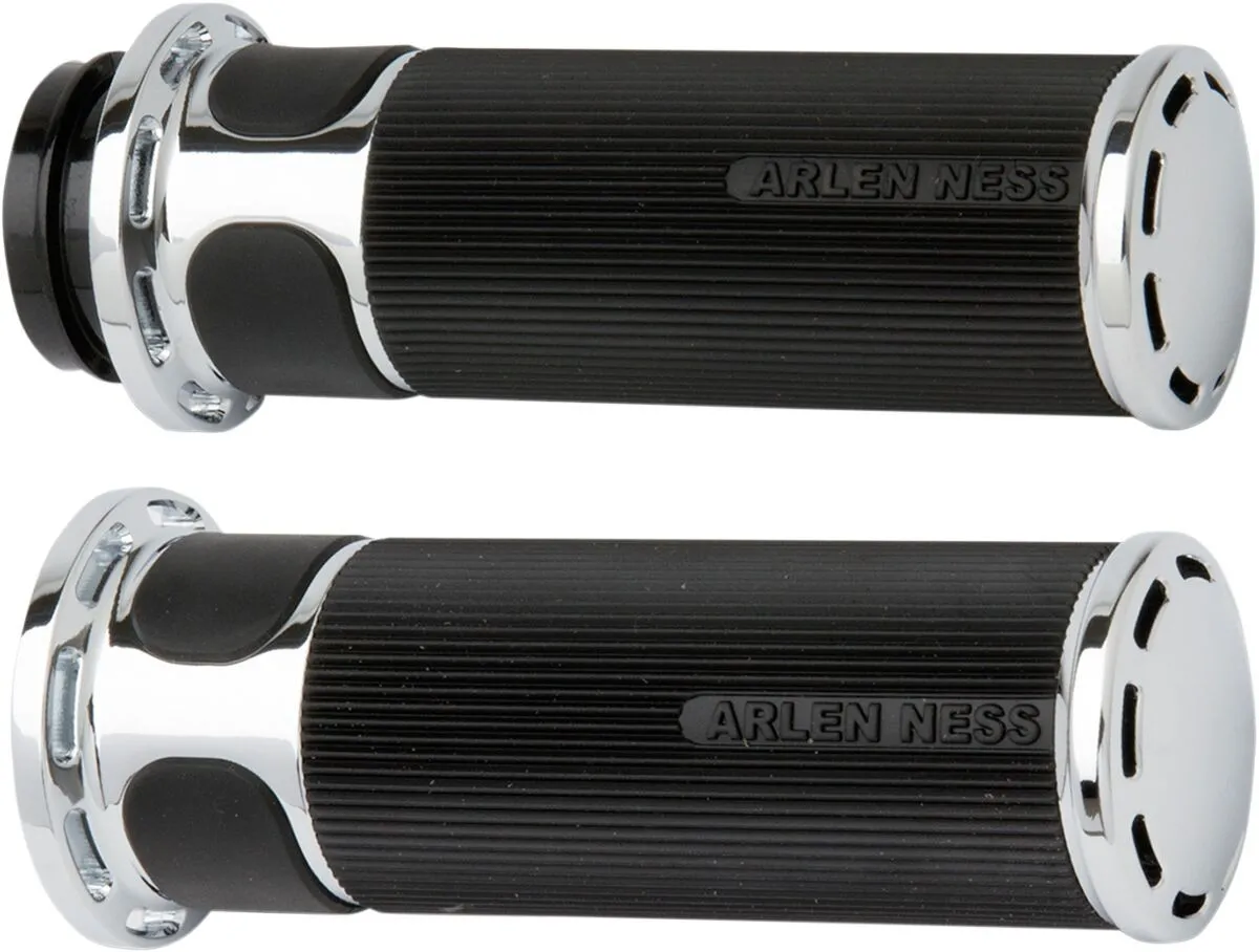 ×Slot Track grips from the Arlen Ness Fusion line feature linear rubber and an air cushion feel thumb pad for excellent comfort and unique styling.