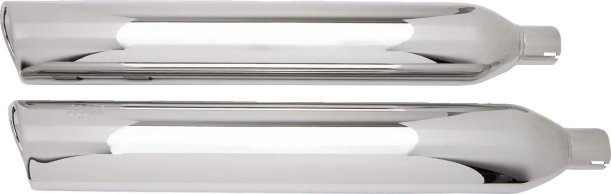 The 4-inch diameter, 909-Twins feature a unique scalloped and smooth rolled outer tip that is matched with a scalloped inner tip. This "Twin" tip design gives an elegant look, especially because there are no visible outer screws securing the core. We use a 2.25-inch louvered core for its traditional and recognizable Harley sound. These mufflers carry our limited lifetime warranty too. Incredible styling, great sound and lifetime warranty. Tough to beat.
