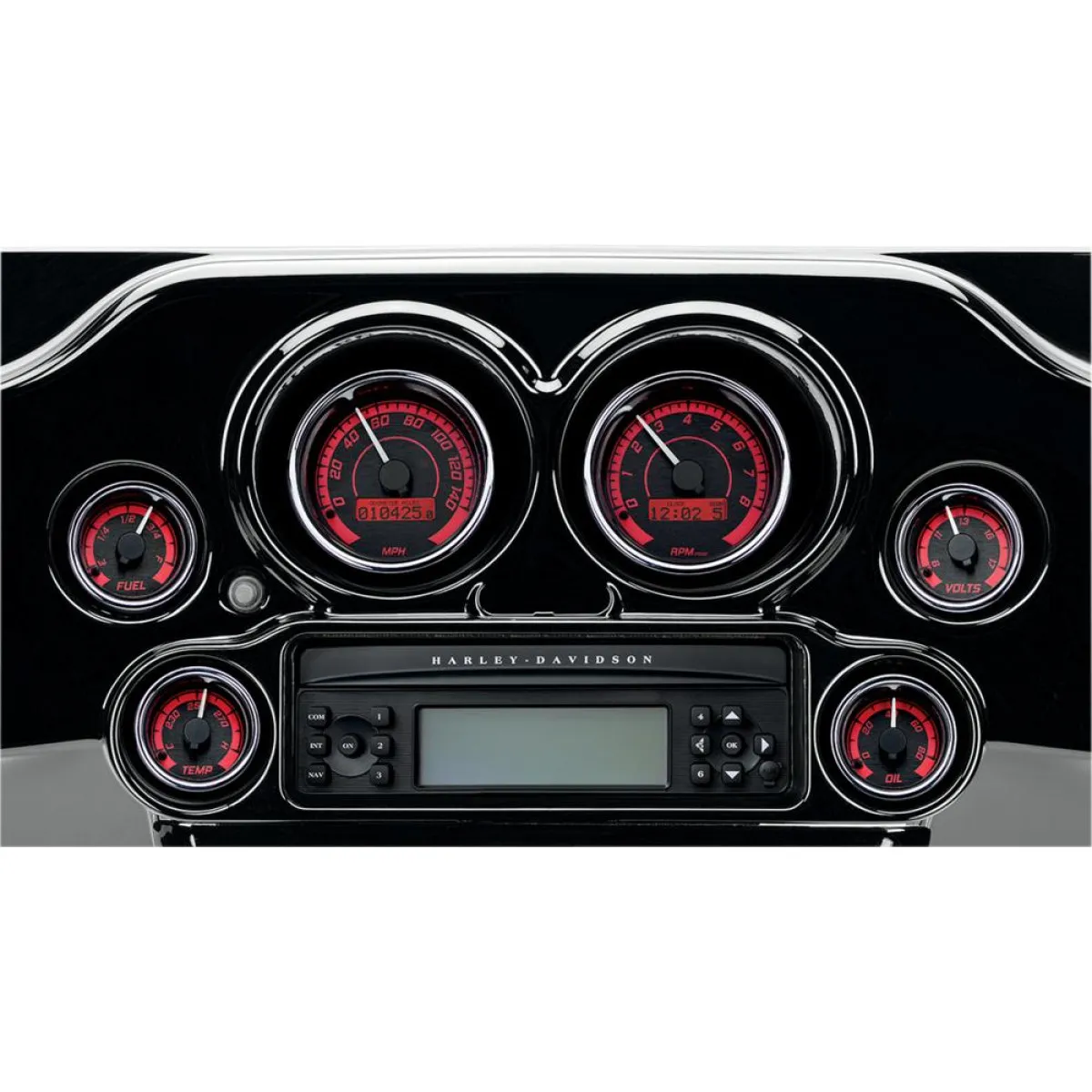 • Dakota Digital Gauge Kit MVX-8K Series in Black Red Background With Chrome Bezel For 2004-2013 FLHT/FLTR/FLHX And HD FL Trike Models (MVX-8604-KR-C)universal fitment