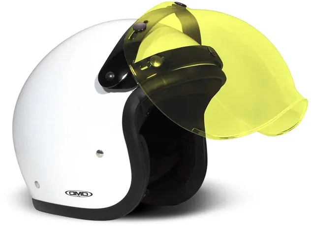 The Flip-Up bubble visor is designed for DMD Jet motorcycle helmets, applicable through the presence of buttons on the helmet shell itself. It also can fit on other brand helmets with a three button point. This visor can be raised and lowered at any time. The Flip-Up visor for open face helmets is available in several colors.