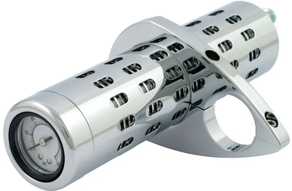 ×Chrome. With 1 clamp. Billet aluminum oil cooler with a built-in gauge. Includes a #6 AN fitting. Clamps to frame tubes of 1", 1-1/8", 1-1/4" and 1 1/2" diameter. Filler sleeves included to compensate for the mentioned frame tube diameters. Will work in many stock or custom applications. Approx. dimensions: 22cm long x 5.6cm diameter.
