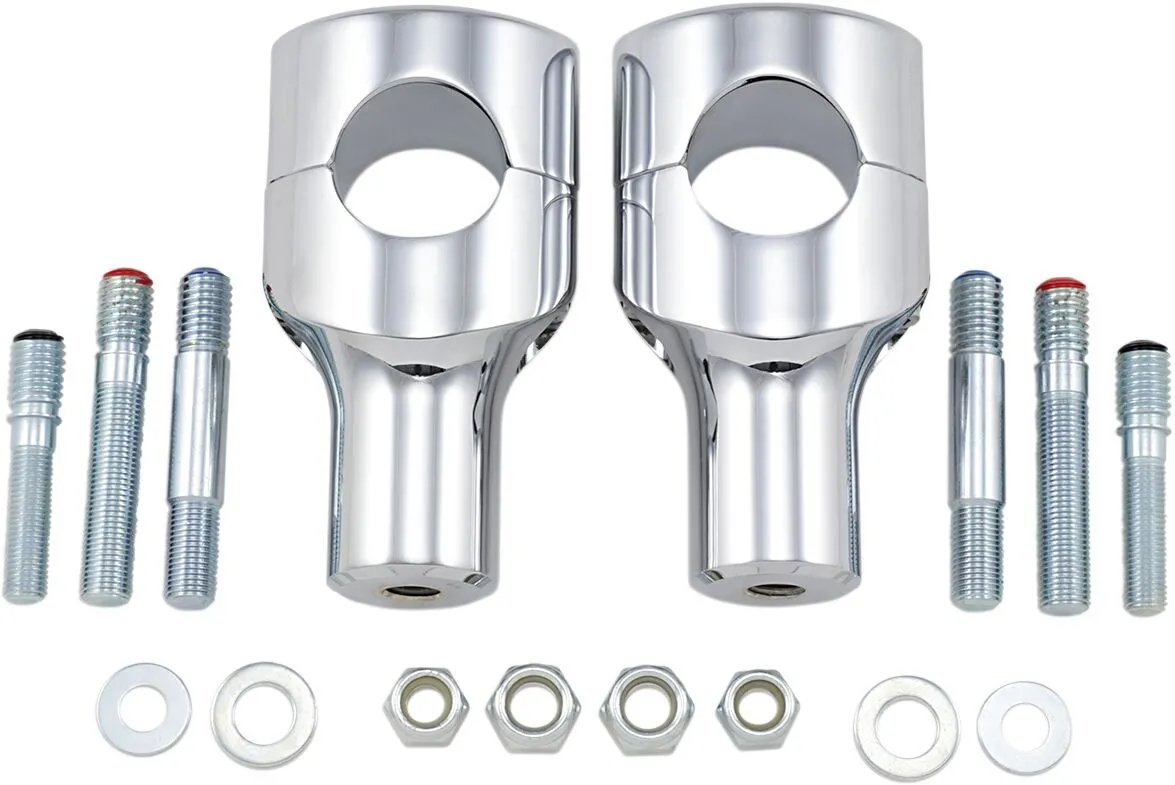 Risers are machined from billet aluminum. Brilliant show-chrome or smooth black finish. For use with Drag Specialties 38mm (1 1/2") Big Buffalo bars or other bars with a 38mm (1 1/2") diameter clamping area. Use 1/2" -13 riser bolts, available separately. Sold in pairs. Made in the U.S.A.