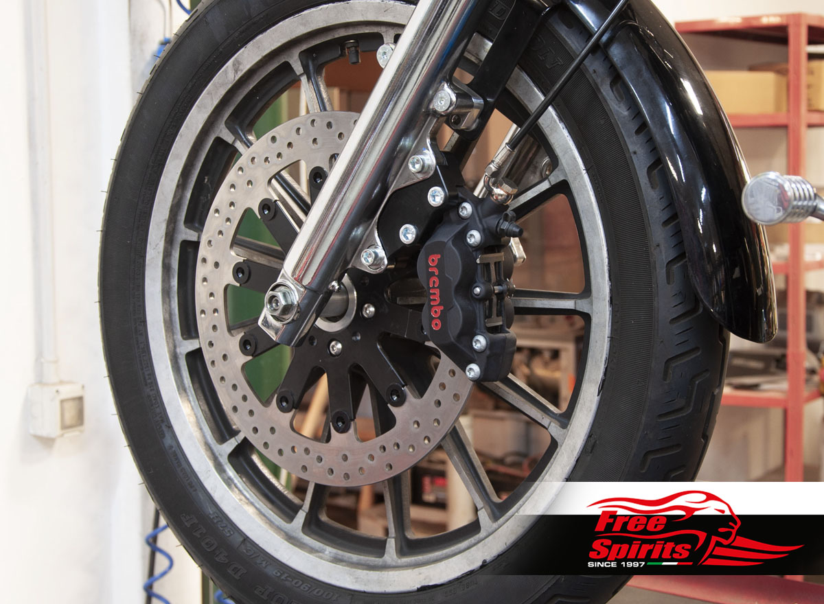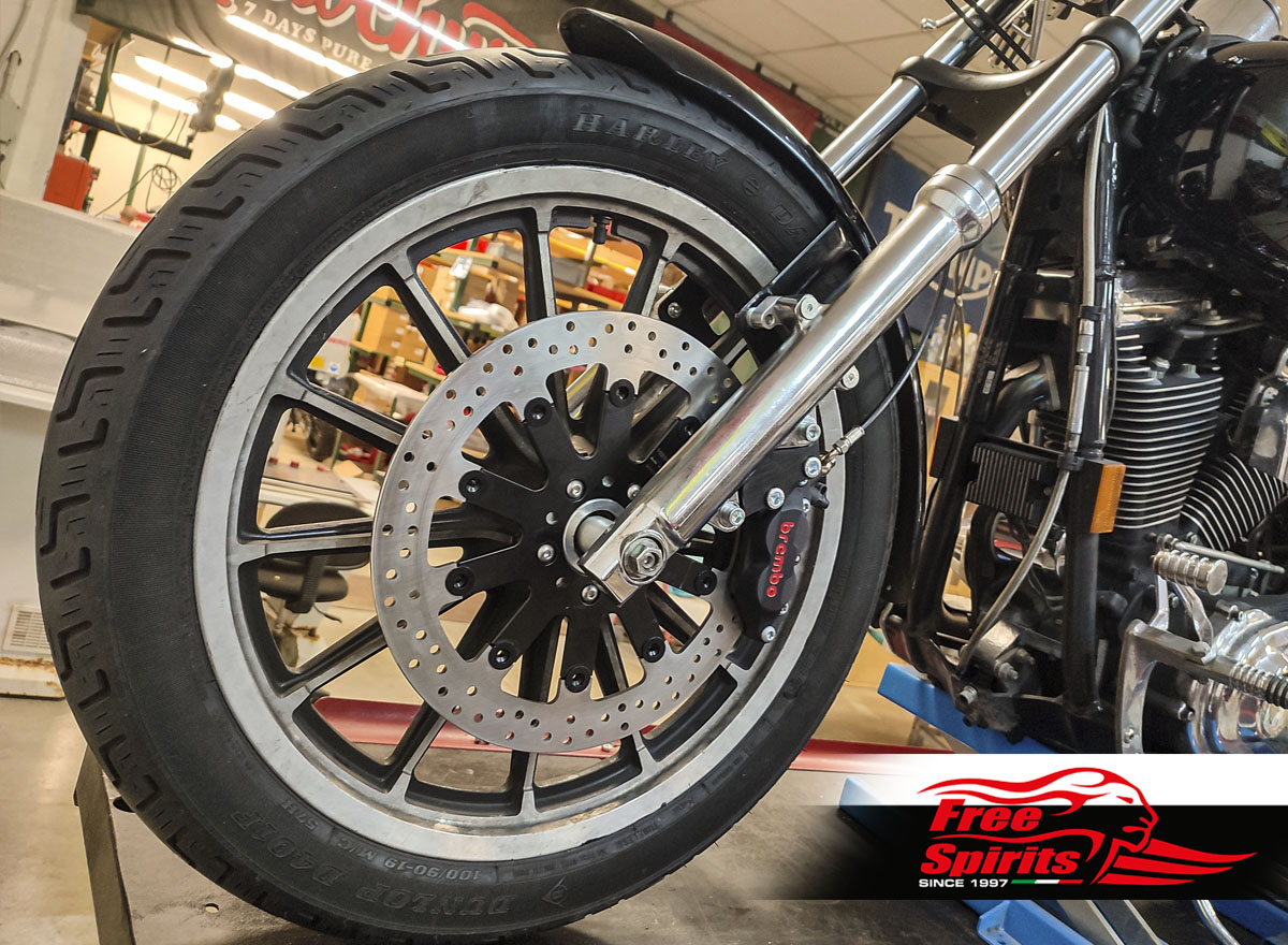 Attention!: The kit must be integrated with triple trees Mid glide (8-1/2″) or Wide glide (9-7/8″) recommended for spoked wheels, brake disc spacers and wheel axle depending on needs.