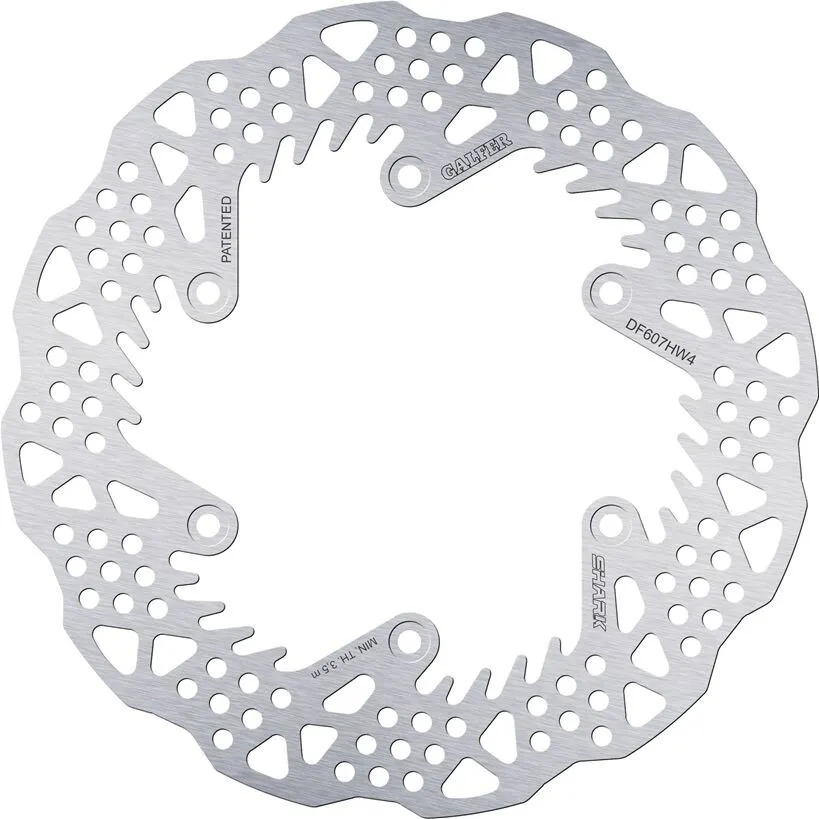 Outside Diameter: 220 mm (8-21/32'') Model: Shark Fin Units: Each Braking Surface: Drilled Product Name: Brake Rotor Bolt Hole Circle: 125,0 mm Color/Finish: Silver Thickness: 4 mm (5/32") Material: Stainless Steel Style: Solid-Mount Inside Diameter: 109 mm (4-19/64") Type: One Piece (Fixed) Shape: Contour Bolt Pattern: 6 Hole