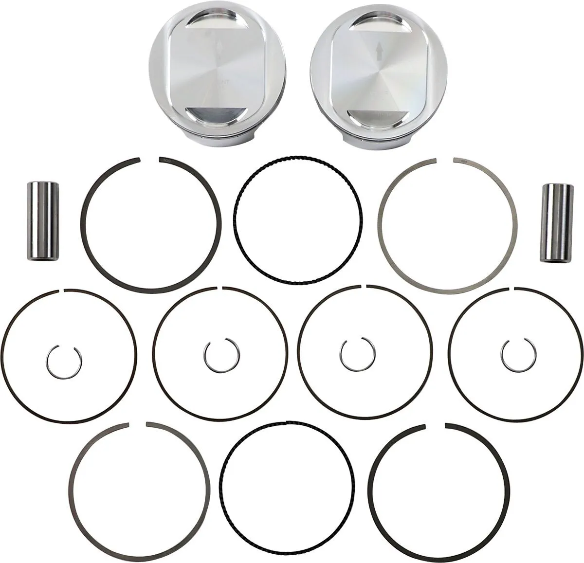 Piston Average Weight: 385 grams Piston Volume: 1.20 cc Two cylinder piston kit. Includes: • 2x Pistons • 2x Ring Sets • 2x Wrist Pins • 4x Circlips