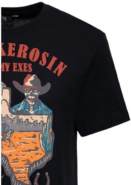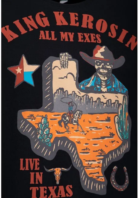 ×Show off your Texan sense of humor with the "All My Exes Live in Texas" t-shirt from King Kerosin! The striking print combines a cowboy skeleton with the unmistakable shape of the state of Texas, a real eye-catcher with a touch of Wild West charm. Crafted from high-quality cotton, the shirt impresses with its first-class comfort and durability. The classic crew neck and regular fit ensure an ideal fit for any adventure. A subtle logo detail on the hem completes the design. With this shirt, you can bring the Lone Star State into your everyday life!