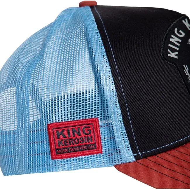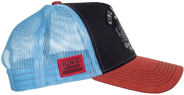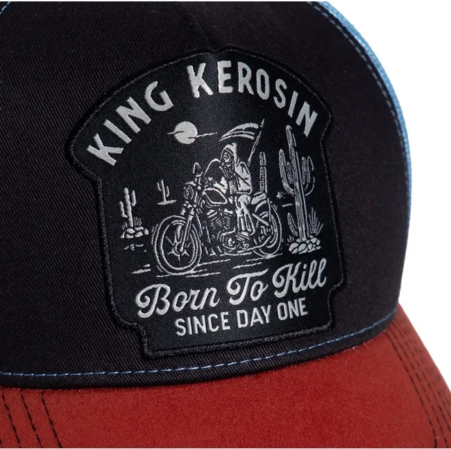 ×This King Kerosin cap screams adventure, the "Born to Kill" embroidery on the front sums up the message: No one takes it easy here! The design depicts a fearless rider amidst cacti and sand, clearly inspired by dusty highways and wild road trips. The combination of a black front, light blue mesh, and a rust-red visor creates a striking look. Thanks to the snapback closure, the cap fits exactly the way you need it to. A statement for those who take life at full throttle.