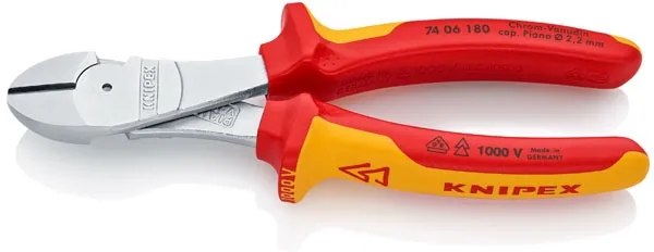 ×Overall diameter: 180mm. Weight: 280 gram. Insulated pliers made conform IEC 60900DIN, EN 60900 and VDE 0680. Individually tested at 10.000V to ensure safe working up to 1000 Volts. With integrated forged joint for very tough continuous usage. With optimized cutting edge angle and lever ratio for 20% effort reduction when compared to comparable diagonal cutting pliers. Manufactured from forged chrome vanadium tool steel that is multi-stage oil hardened. Cutting edges are additionally precision induction hardened to approx. 64 HRC and will cut from 3.8mm steel up to 2.2mm diameter hard spring steel. Comes with multicomponent grips, a polished head and is chrome plated.