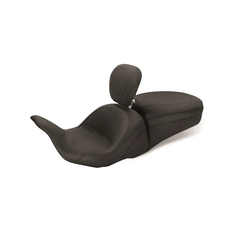 The rider's bucket is shaped and angled for optimal touring posture on the go, but it also drops you from stock position on most models, and is cut narrow at the front, so you can plant your feet firmly on the ground at a stop.