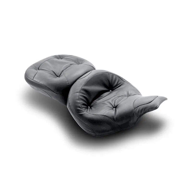 Mustang Ultra Touring seats are narrower at the nose so the driver's feet can easily reach the ground. The baseplate has been contoured in front to eliminate the ahrd spots the rider feels on long trips with the stock seat. The rear seat has wide internal support wings to keep the passenger up off the handrail. The seat is contoured to better clear the saddlebag lids and is split toa ccept the stock driver backrest kit. Both styles feature a 18" wide front bucket with a 15" wide passenger seat.