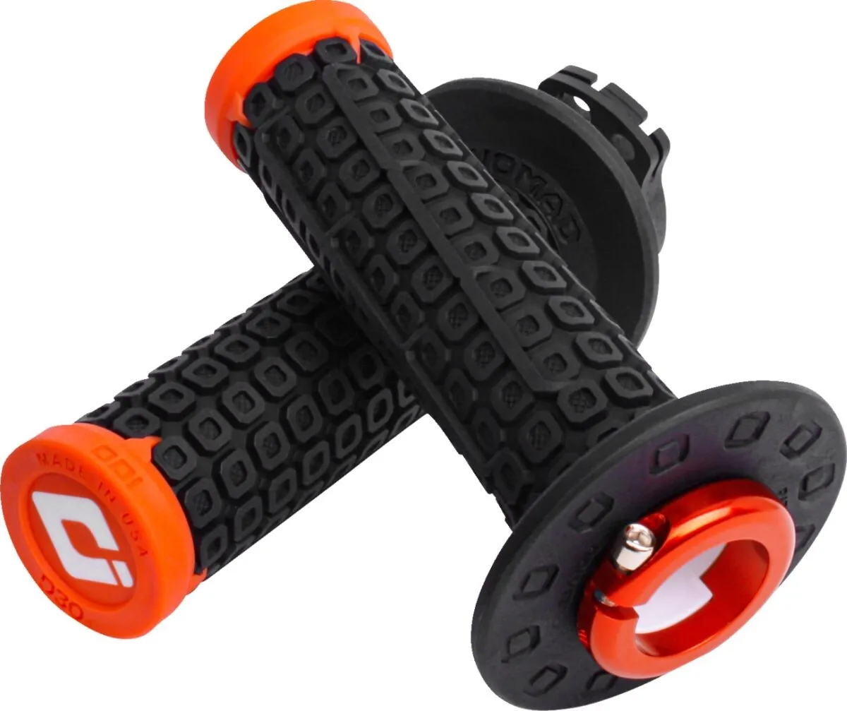 Base Color: Black Material: Composite Color/Finish: Black| Flat| Orange Graphic: ODI Product Name: Grips Texture: Medium Units: Pair Model: Nomad For Handlebar Diameter: 22 mm (7/8") Mount Type: Lock-On Style: Cam| Closed End| Flange| Universal| Waffle Base Finish: Flat