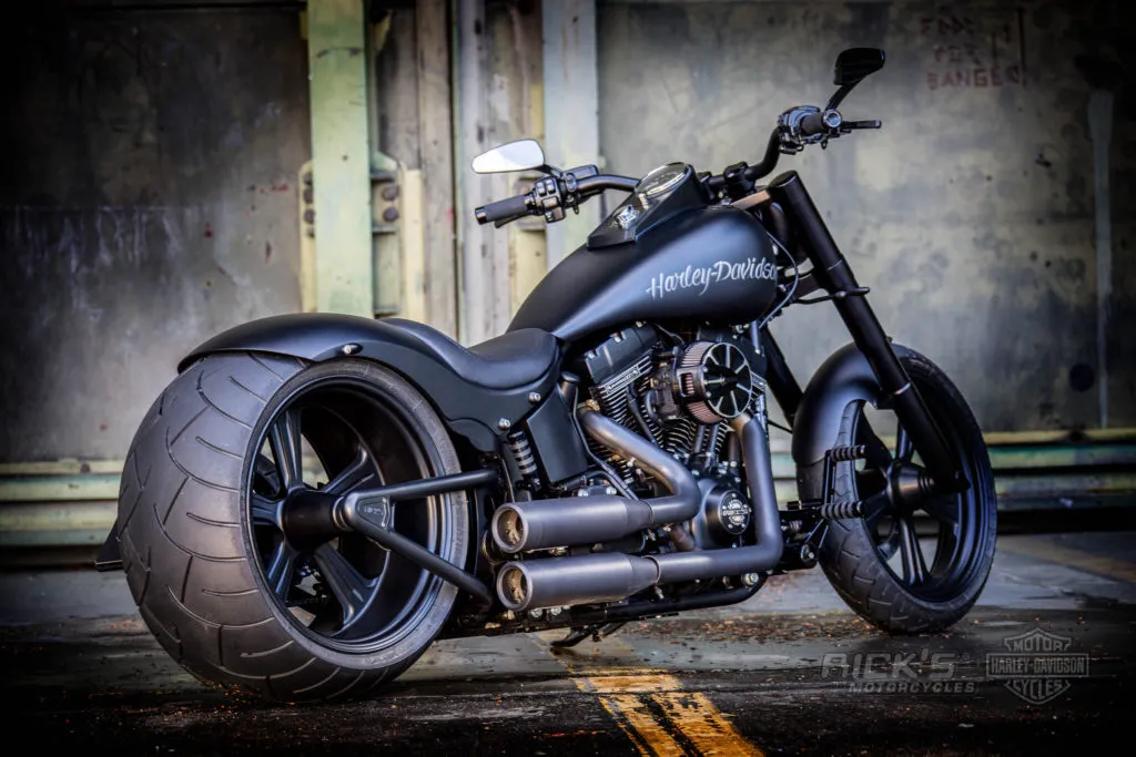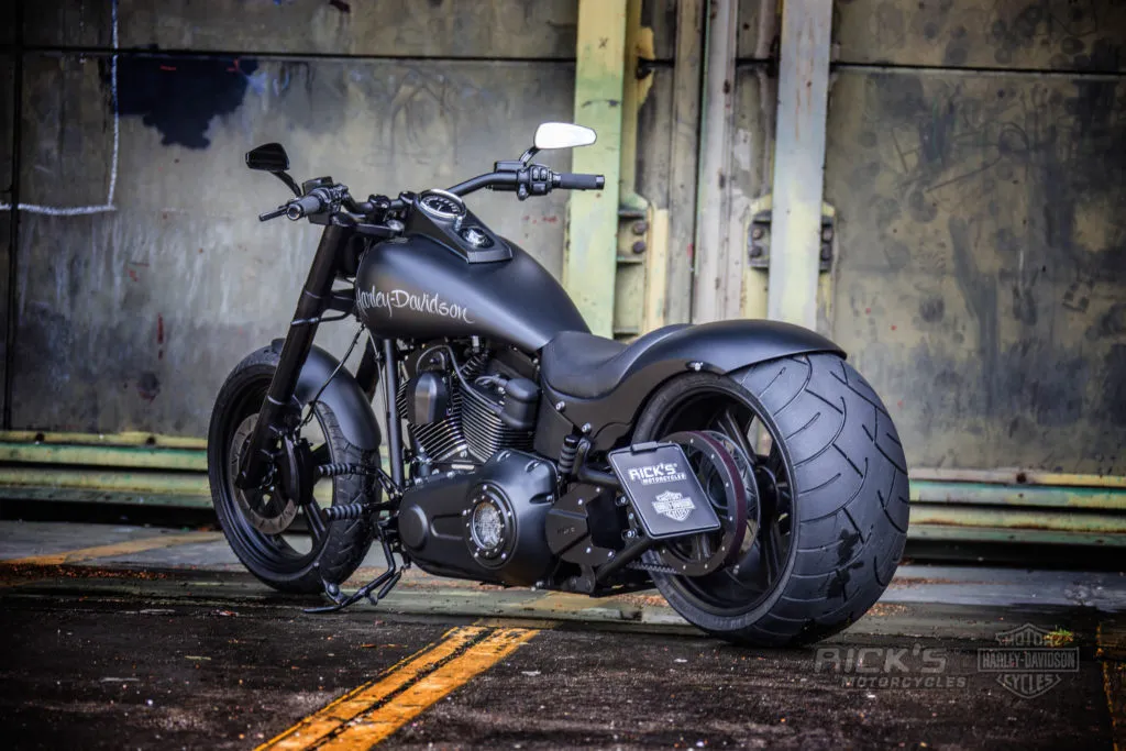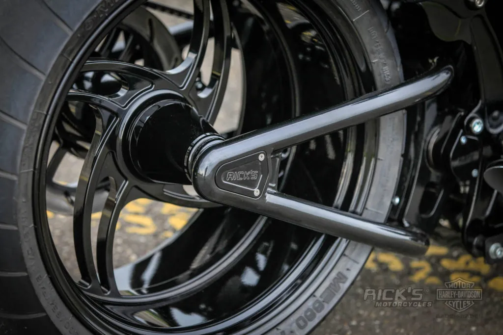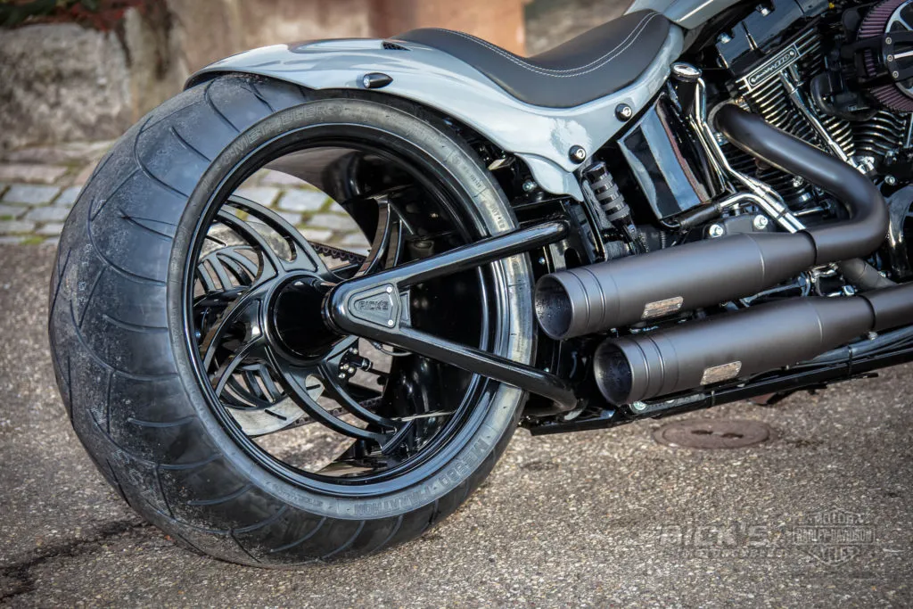 With Rick's new 'Wide Tire Kit' for Twin Cam Softail models, the swingarm fits into the original HD stock frame and even a 360 tire runs centred.