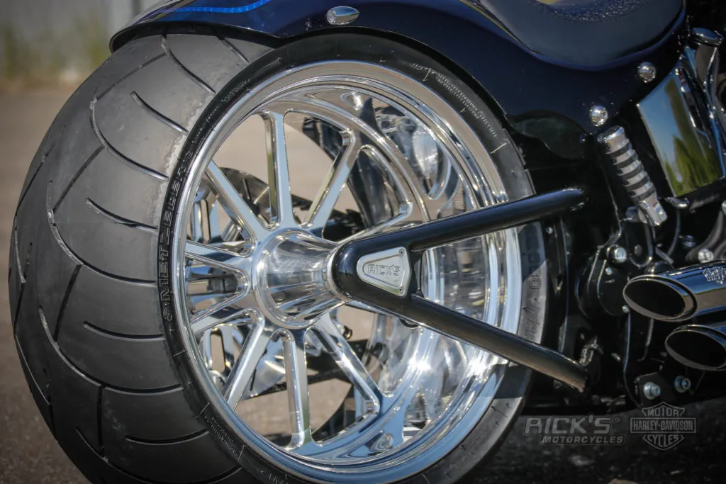 With Rick's new 'Wide Tire Kit' for Twin Cam Softail models, the swingarm fits into the original HD stock frame and even a 360 tire runs centred.