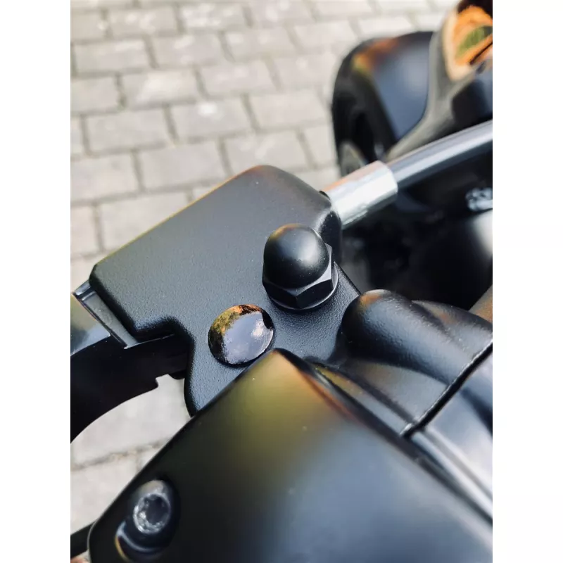 ×Set of two black powder coated stainless steel 5/16-24 UNF acorn nuts and spring washers for all handlebar mounted mirrors on 1982 to present Big Twin, FXR, Softail, Dyna, Touring and XL & XR Sportster. Can also be used to replace OEM 7331 chrome acorn nuts.