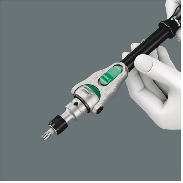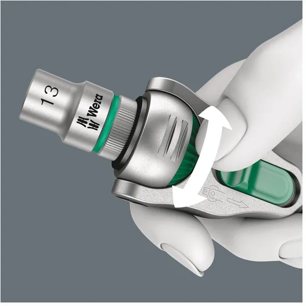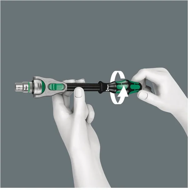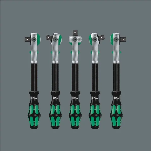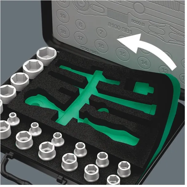 ×8100 SA 4. 41-piece 1/4" drive in US sizes. Large kit, ready to tackle most smaller wrenching needs. Includes a Zyklop ratchet, a Zyklop extension with free-turning sleeve, a Zyklop wobble extension, a Zyklop swivel joint, a sliding T-handle, a Zyklop bit adapter socket with quick release chuck, 10 sockets from 3/16" to 9/16" with a brushed chrome finish, color coding, ball intercept ring and knurls at the base for manual turning. Not for impact use. Includes bits for Torxr, Hex (Allen heads), Phillips, Pozidriv and slotted screws. All is packed in a metal box. Kit contains: 8000 A Zyklop speed ratchet 1/4" drive x 152mm long. Innovative function-packed ratchet with multi-component Kraftform handle. The green free-turning ribbed sleeve is for switching between left & right ratcheting. The swiveling ratchet head can be locked at 0 and 90 and 15 before 90 inwards. Locked at 0 it allows use as a conventional screwdriver. With pushbutton socket release and a fine ratchet tooth design allowing a small 5 return angle. 8790 HMA - Zyklop sockets 1/4" drive for hex bolts and nuts. 23mm long. Knurled at the base for manual turning. With ball intercept ring. Incl. 3/16", 7/32", 1/4", 9/32", 5/16", 11/32", 3/8", 7/16", 1/2", 9/16" 8789 A - Zyklop sliding T-handle 1/4" drive. Overall length 110mm. 8794 A - Zyklop wobble extension 1/4" drive x 56mm long. Allows 15 connection angle in all directions. 8795 A - Zyklop universal swivel joint 1/4" drive chrome vana