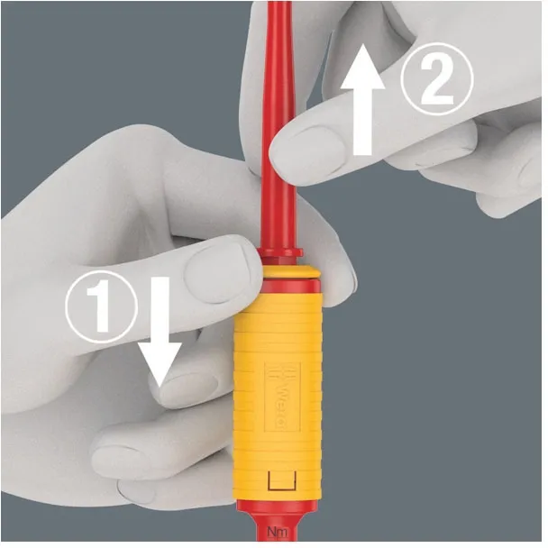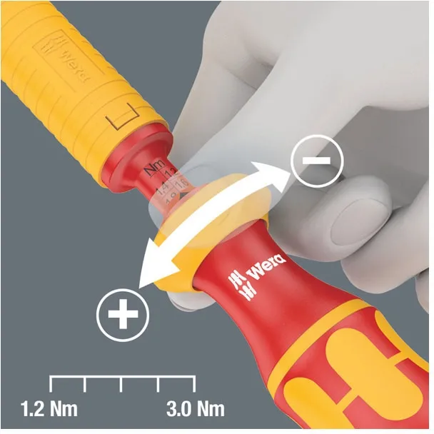 ×7441 VDE insulated torque shaft handle. 1.2 to 3.0 Nm adjustable. Compatible with Wera compact VDE 9mm hexagonal interchangeable screwdriver shafts only, which offer a simple click-fit installation and pull-back knob release. Allows working with live wiring up to 1000V, individually tested as per IEC 60900. Torque handle measurement accuracy is 6 % in accordance with the standard EN ISO 6789. The torque signal can be both felt & heard. With multi-component Kraftform shaped grip. Note: Wera individual insulated VDE compact screwdriver shafts are separately available.