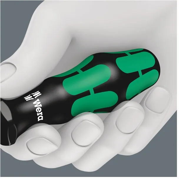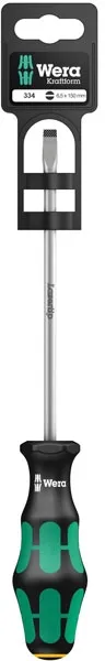 ×Series 300 slotted screwdriver. With multi-component Kraftform handle and a chrome plated lasertip. With the classic small wider taper in the shaft above the tip. Shaft: Round throughout. Tip thickness at tip: 1.2mm. Tip width: 6.5mm. Shaft length: 150mm.