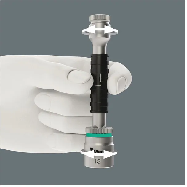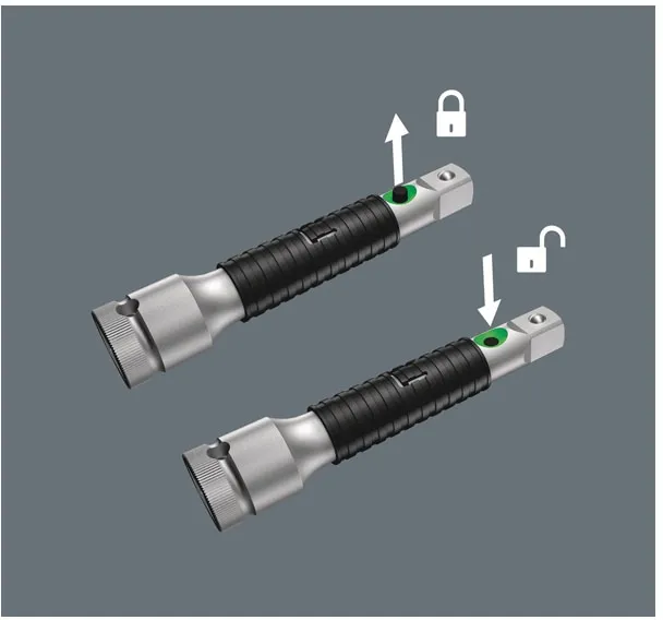 ×8796 SA. 1/4" drive x 75mm long. With ball lock and free turning sleeve. With flexible lock & unlock system which allows you to lock, or unlock, the socket by pushing a pin in the extension. Sockets will never come loose unintentionally. The free turning sleeve allows you to firmly grip the extension while ratcheting. Chrome vanadium with a brushed chrome plated finish.