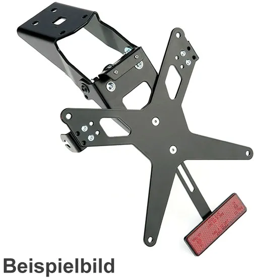 ×Black powder coated universal license plate bracket for use in custom applications. Designed to mount under the fender. Offers stepless angle adjustability, takes license plates up to 175mm wide and the turn signal brackets are 3-position adjustable. Comes with a red reflector and an ECE approved LED license plate light. Includes installation hardware.